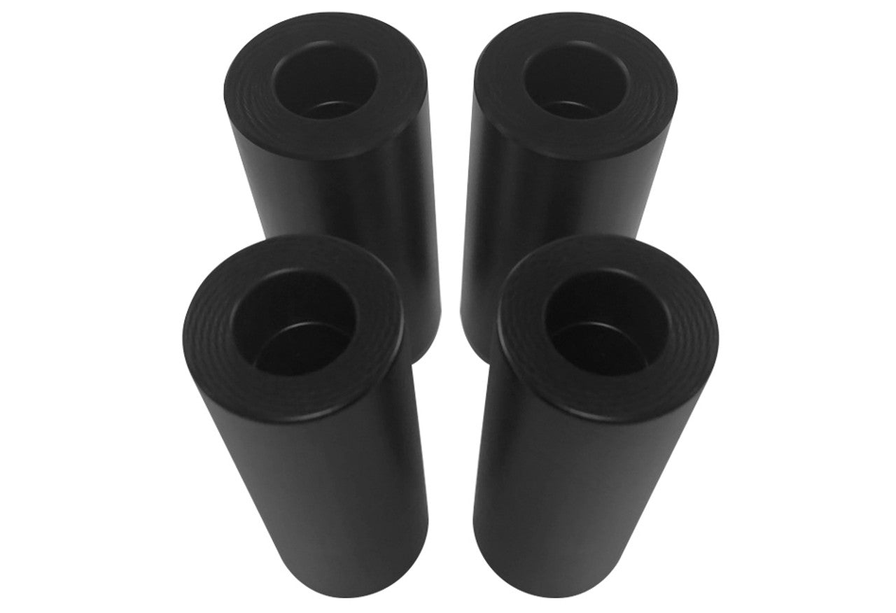 The Steeda Mustang IRS Subframe Alignment Kit is made from CNC-machined Delrin to avoid putting two dissimilar metals next to each other, preventing corrosion. Delrin is also less weight then aluminum or steel inserts and therefore keeping performance in mind. The Delrin sleeves slide into the subframe mounting holes, and fill the extra space left between the subframe mount and bolt from the factory.